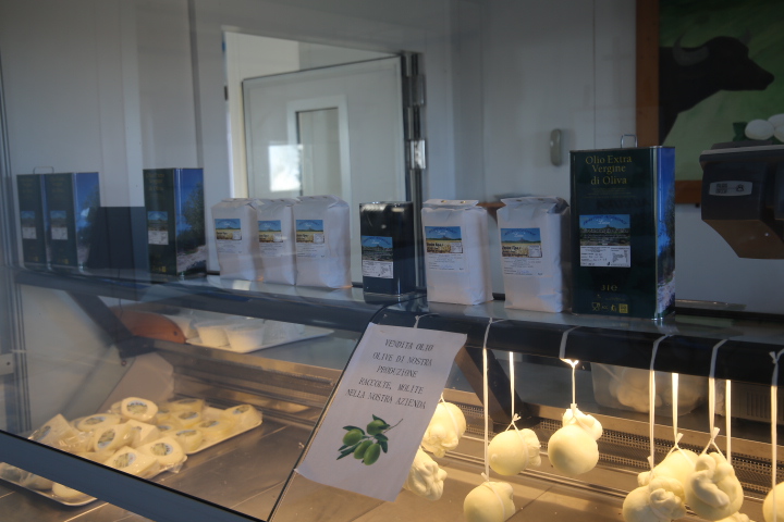 I controlli giornalieri, la cura nelle lavorazioni, l’allevamento “naturale” delle bufale assicurano al prodotto finale un’altissima qualità, riconosciuta anche dal Marchio Tuscia Viterbese. Il latte di bufala prodotto in azienda fornisce un’elevata resa casearia. Per fare un esempio, con 100 kg di latte bufalino si ottengono circa 25 kg di mozzarella e 3 kg di ricotta. Il Caseificio offre un’ampia offerta di prodotti caseari: mozzarella (sino ad un massimo di 2 kg cadauna), ricotta fresca, burrata, caciotte stagionate in grotta, provola stagionata ed affumicata, scamorza fresca ed affumicata, stracchino, ricotta salata, yogurt, primo sale. Oltre la vendita diretta nel caseificio aziendale, vengono effettuate consegne a supermercati locali e punti vendita alimentari. Il prodotto più venduto è la classica mozzarella di bufala. Angela ci ha spiegato, in breve, come viene realizzata: “il latte viene portato a 36-37 °C, poi vengono aggiunti in percentuale, caglio animale liquido ed una parte di siero-innesto (derivato dalla lavorazione del gg precedente). Dopo un’ora dalla cagliatura viene tolto il siero per produrre la ricotta. La pasta residua si lascia maturare per altre 3 ore dopodiché si inizia con la preparazione della mozzarella. Le grandi mozzarelle vengono tagliate a mano, mentre quelle piccole vengono tagliate con la formatrice”.